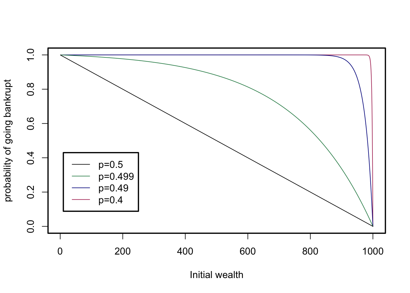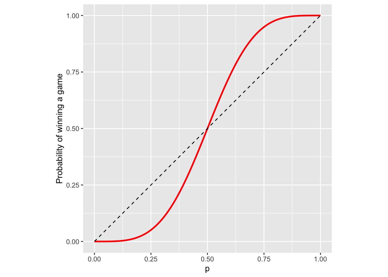 prob_game = sapply(ps, prob_win)A graph of p vs. prob_game, where the dashed line is the line \(y=x\) looks like this: