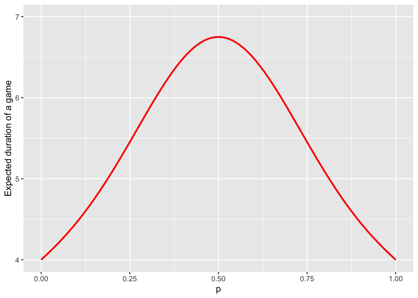 The maximum of the curve about equals to \(6.75\), and is achieved when the players are evenly matched (\(p=0.5\)). Therefore, a game between fairly equally matched opponents lasts \(6.75\). The game cannot be shorter than \(4\) rallies and that is exactly the expected duration when one player wins with certainty in each rally.