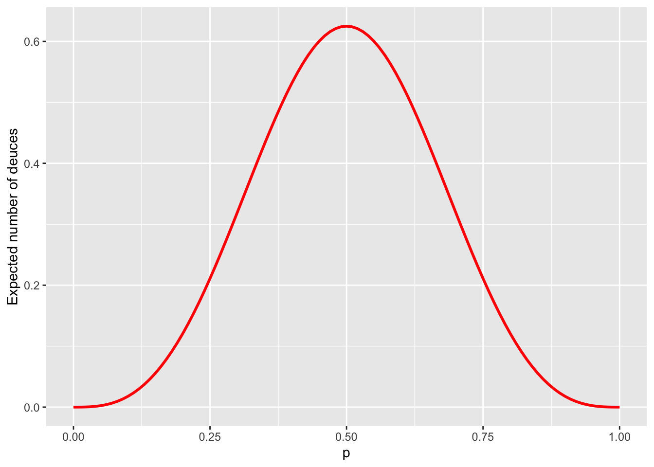 Problem 7.4 What is the expected number of “deuces”, i.e., scores \((40,40)\)? Compute it for several values of the parameter \(p\).
