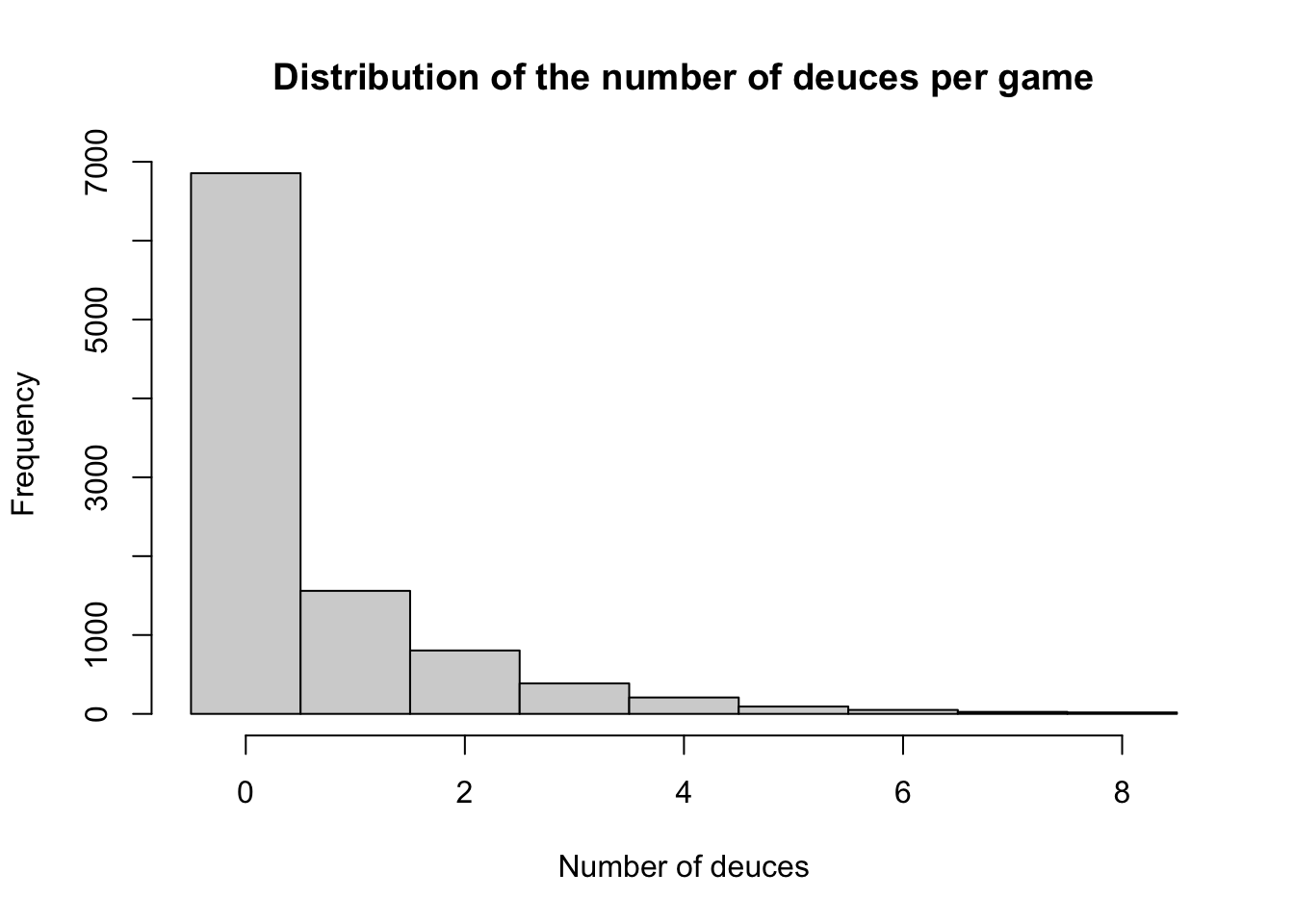 These numbers are a bit misleading, though, and, when asked, people would usually give a higher estimate for this expectation. The reason is that the expectation is a poor summary of for the full distribution of the number of deuces. The best way yo to get a feeling for the entire distribution is to run some simulations. Here is the histogram of \(10000\) simulations of a game of tennis for the most interesting case \(p=0.5\):