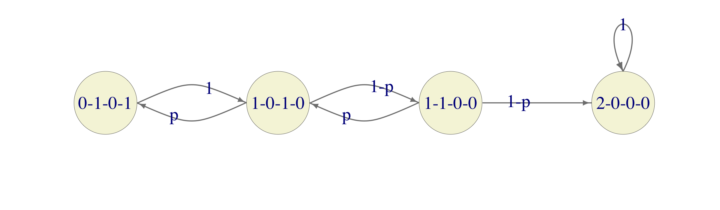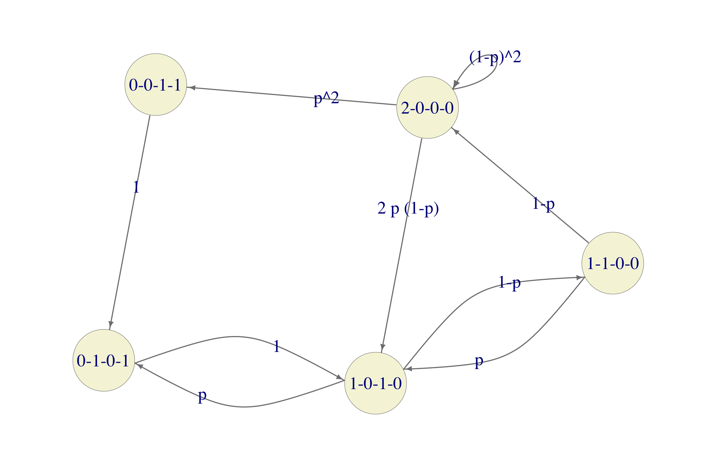 Solution. Any of the computers can be in one of the following 4 conditions: in operation (OK), in repair facility - 2nd day (R2), in repair facility - 1st day (R1), waiting to enter the repair facility (W). Since there are two computers, each state of the Markov chain will be a quadruple of numbers \((OK, R2, R1, W)\) denoting the number of computers in each conditions. For example, 1-0-1-0 means that there is one computer in operation (OK) and one which is spending its first day in the repair facility (R1). If there are no computers in operation, the chain moves deterministically, but if 1 or 2 computers are in operation, they break down with probability p each, independently of the other. For example, if there are two computers in operation (the state of the system being 2-0-0-0), there are 3 possible scenarios: both computers remain in operation (that happens with probability \((1 − p)^2\)), exactly one computer breaks down (the probability of that is \(2p(1 − p)\)) and both computers break down (with probability \(p^2\)). In the first case, the chain stays in the state 2-0-0-0. In the second case, the chain moves to the state 1-0-1-0 and in the third case one of the computers enters the repair facility, while the other spends a day waiting, which corresponds to the state 1-0-1-0. All in all, here is the transition graph of the chain: