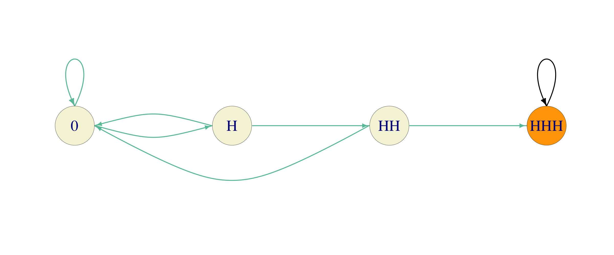 Solution. We start by choosing a pattern, say \(HTH\), and computing the number of coin tosses Alice expects to make before it appears. This is just the kind of computation that can be done using our absorption-and-reward techniques, if we can find a suitable Markov chain. It turns out that the following will do (green arrows stand for probability \(1/2\)):