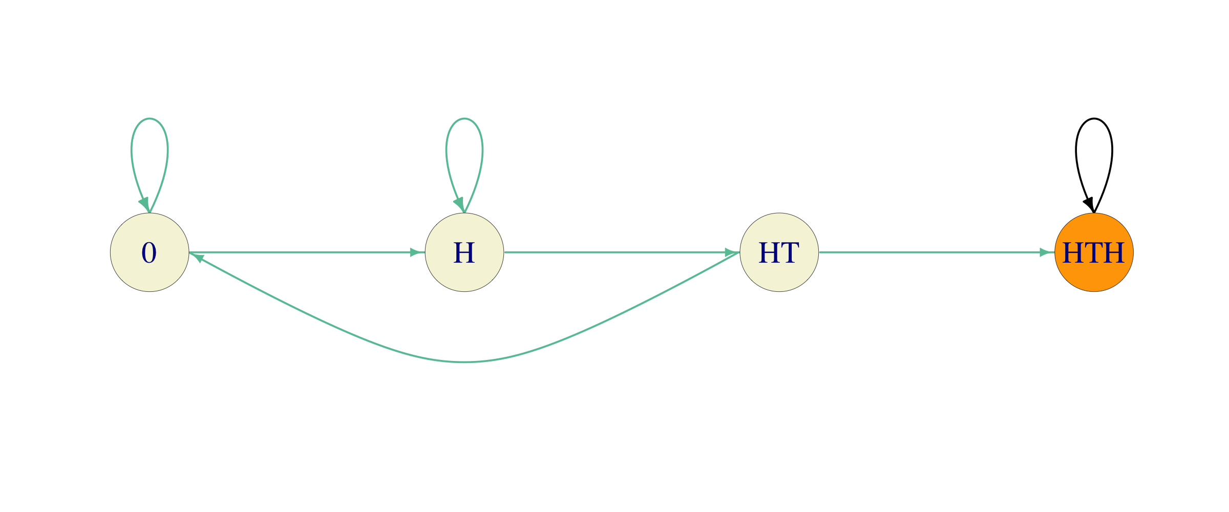 As Alice tosses the coin, she keeps track of the largest initial portion of her pattern that appears at last several places of the sequence of past tosses. The state \(0\) represents no such portion (as well as the intial state), while \(HT\) means that the last two coin tosses were \(H\) and \(T\) (in that order) so that it is possible to end the game by tossing a \(H\) next. On the other hand, if the last toss was a \(T\), there is no need to keep track of that - it is as good as \(0\).