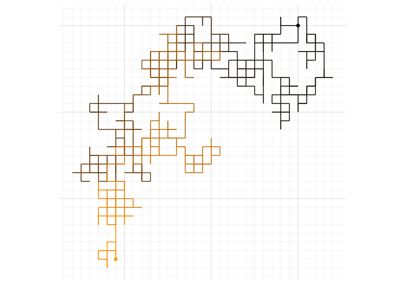 In addition to the simple symmetric random walk on the line (\(d=1\)) we studied before, one can consider random walks whose values are in the plane (\(d=2\)), the space (\(d=3\)), etc. They defined as Markov Chains with the state space \(S={\mathbb{Z}}^d\) and the following transitions: starting from the state \((x_1,\dots, x_d)\), it picks one of its \(2d\) neighbors \[\begin{align} & (x_1+1,x_2, \dots, x_d), (x_1-1,x_2, \dots, x_d),\\ &(x_1, x_2+1,\dots, x_d), (x_1, x_2-1,\dots, x_d),\\ &... \\ &(x_1,x_2, \dots, x_d+1), (x_1,x_2, \dots, x_d-1)\end{align}\] randomly and uniformly and moves there. For illustration, here is a picture of a path of a two-dimensional random walk; as time progresses, the color of the edges goes from black to orange, edges traversed multiple times are darker, dots mark the position of the walk at time \(n=0\) (the black round dot) and at time \(n=1000\) (orange square dot):