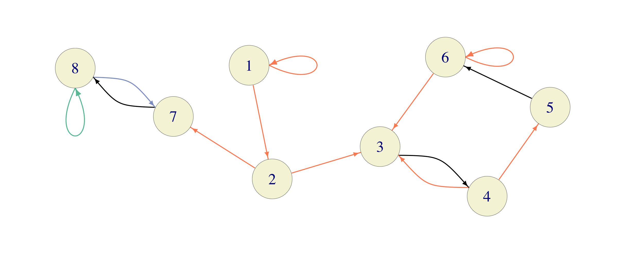 Problem 6.12 Consider a Markov Chain whose transition graph is given below (with orange edges having probability \(1/2\), black \(1\), blue \(3/4\) and green \(1/4\))