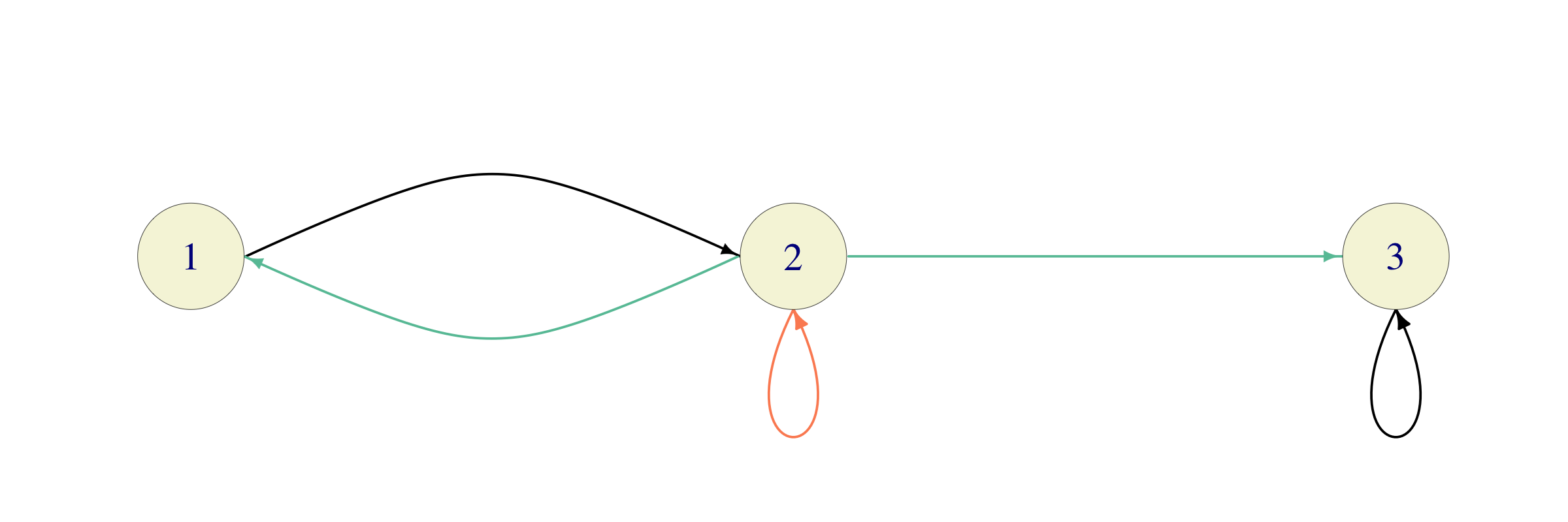 Solution. Consider the following chain for the counterexamples (where red edges have probability \(1/2\), black \(1\) and green \(1/4\))
