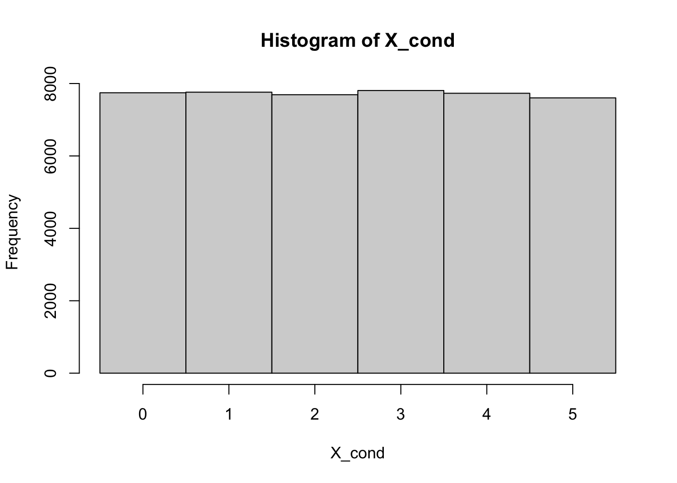 rbindto append a row to a data frame, but you can do this in many other ways.nsim = 100000 df = data.frame() for (i in 1:6) { for (j in 1:6) { for (k in 1:6) { if ((i != j) & (j != k) & (i != k)) { df = rbind(df, c(i, j, k)) } } } } colnames(df) = c("x", "y", "z") rows = as.numeric(row.names(df)) # as.numeric needed to turn strings into integers sampled_rows = sample(rows, nsim, replace = TRUE) sims = df[sampled_rows, ]The probability of seeing a pair \((i,j)\) is \(0\) if \(i=j\) and \(1/30\) otherwise (where \(30\) is the number of pairs of different numbers).