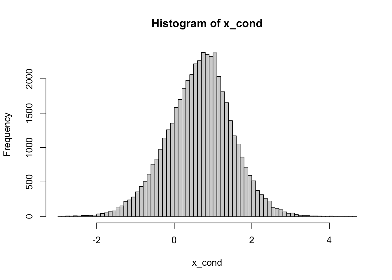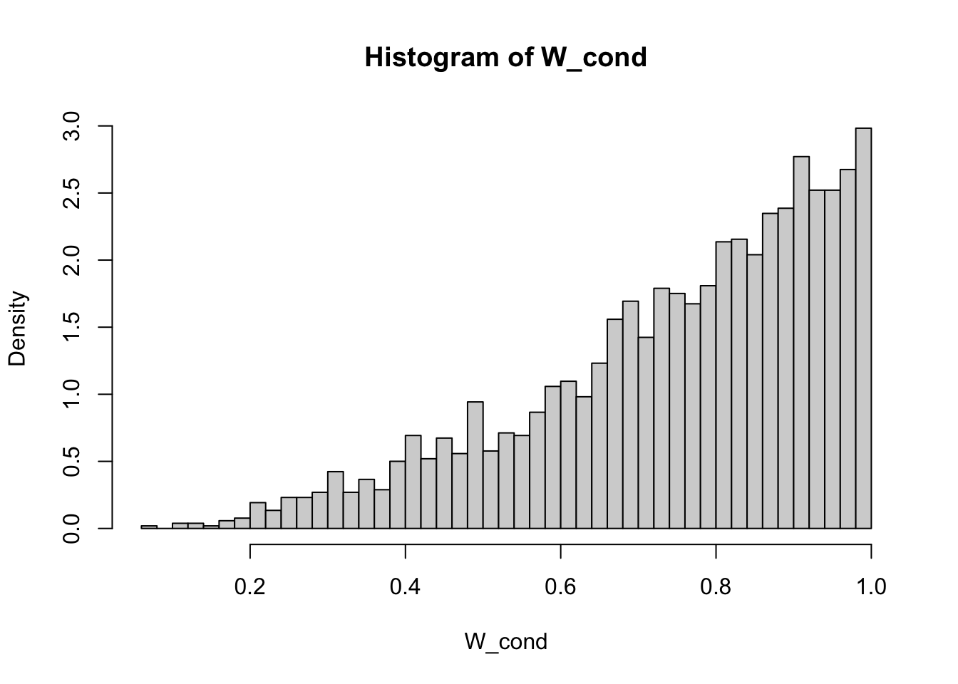 d1 = sqrt((x - 1)^2 + (y + 1)^2 + (z - 1)^2) d2 = sqrt((x - 1)^2 + (y + 1)^2 + (z + 1)^2) condition = d1 < d2 W_cond = W[condition] hist(W_cond, breaks = 50, probability = T)