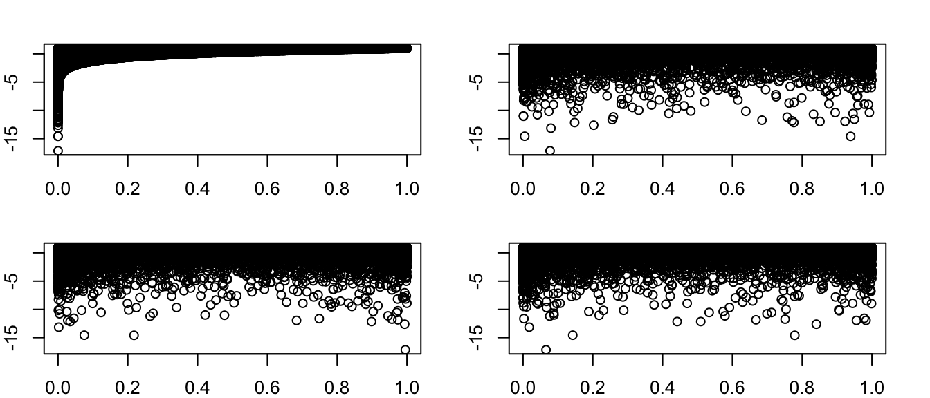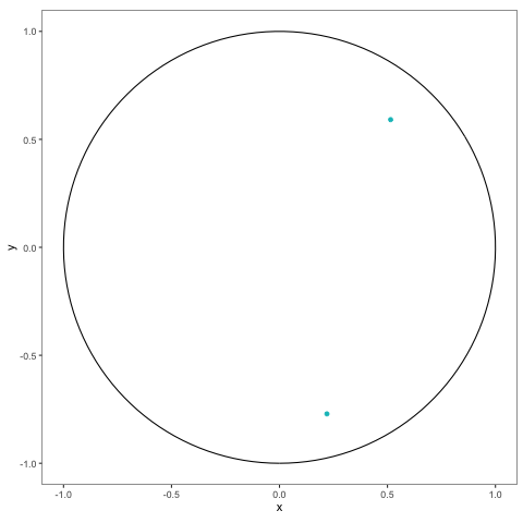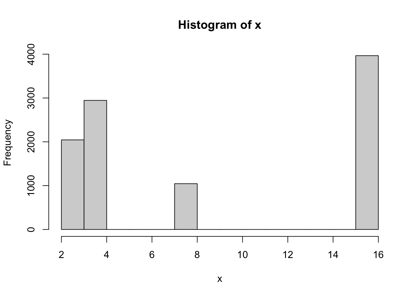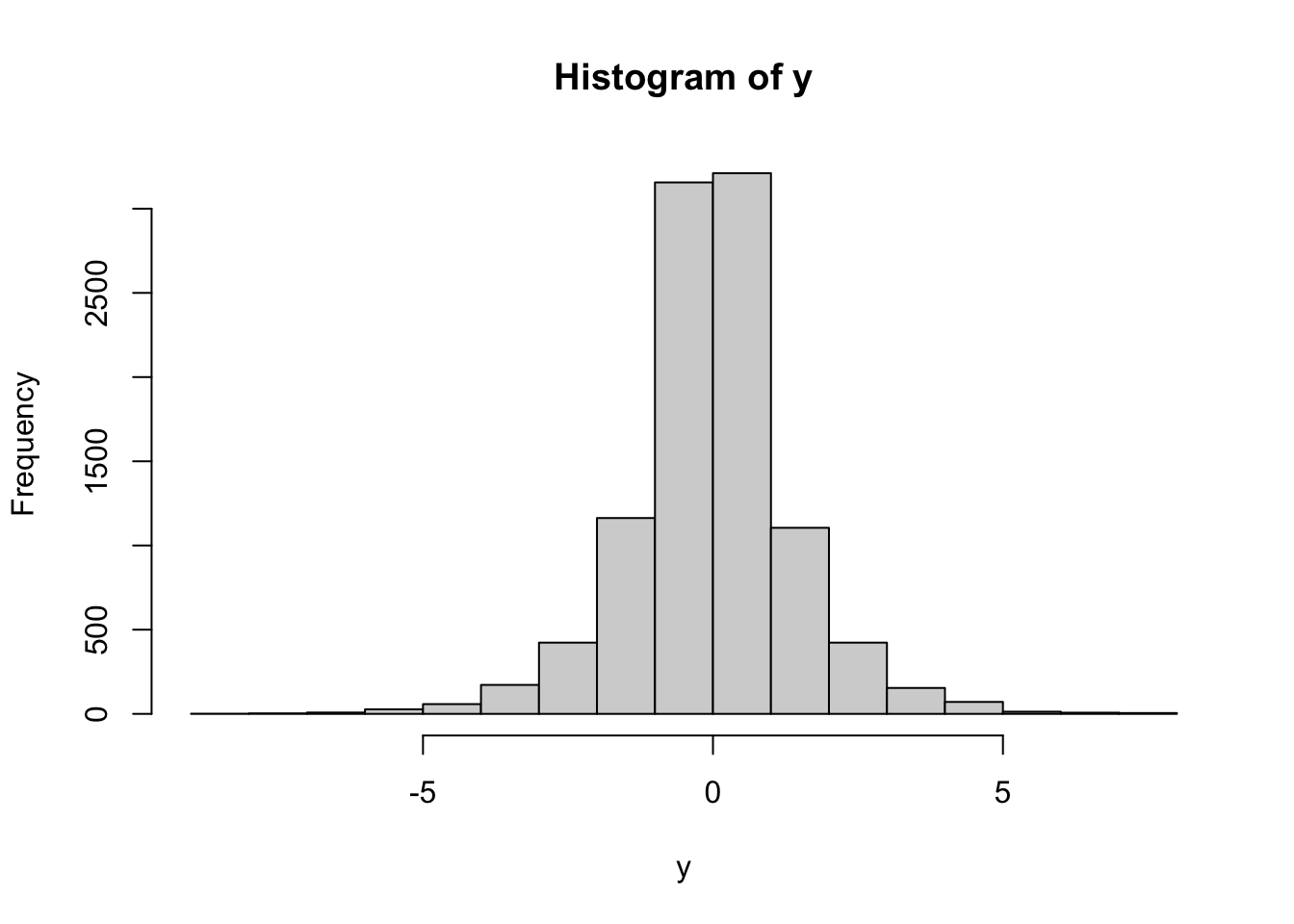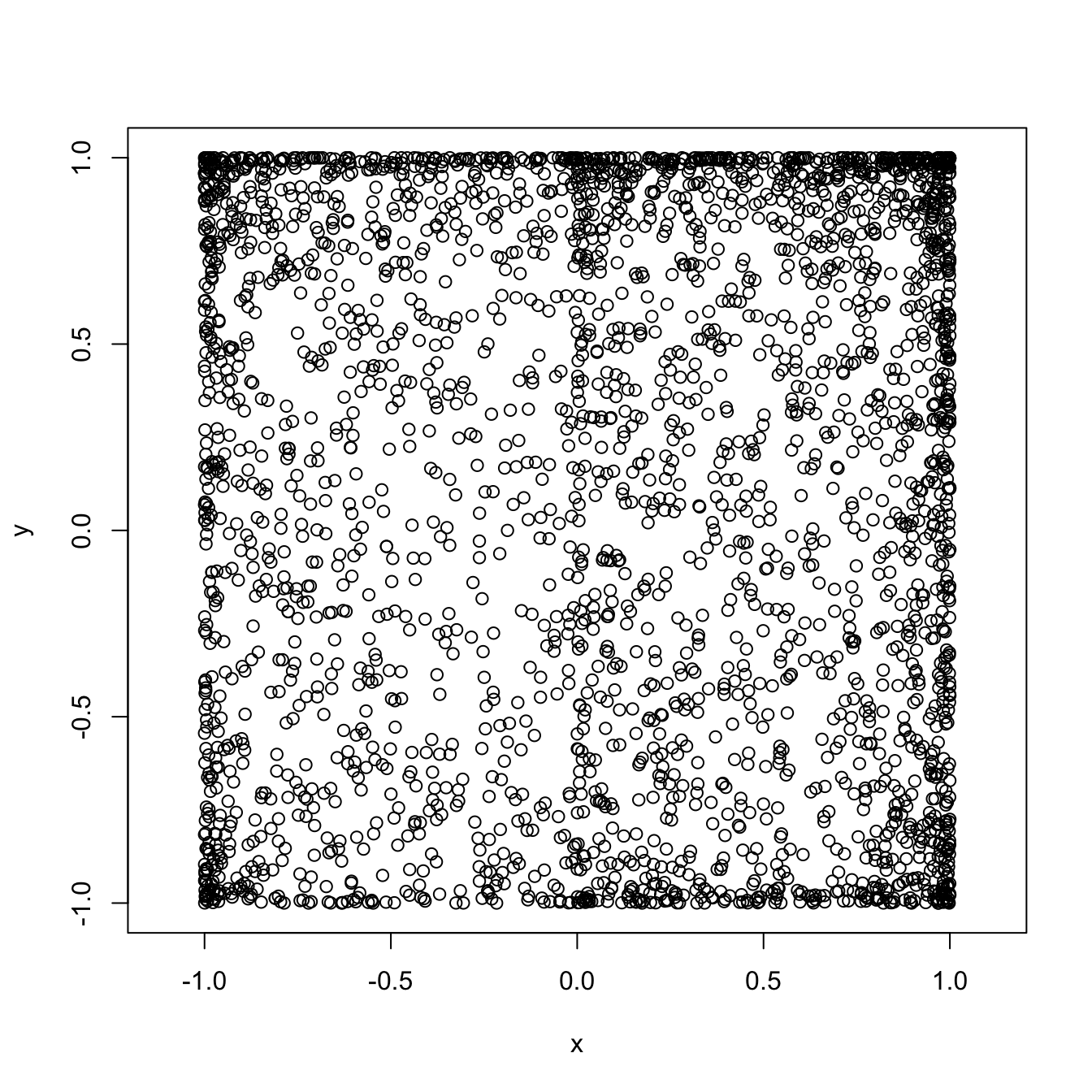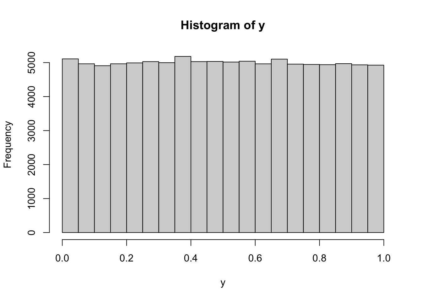 Comments (Math): You could spend your whole life trying to understand what it really means to “simulate” or “generate” a random number. The numbers you obtain from so-called random number generators (RNG) are never random. In fact, they are completely deterministically generated. Still, sequences of numbers obtained from (good) random number generators share so many properties with sequences of mythical truly random numbers, that we can use them as if they were truly random. For the purposes of this class, you can assume that the numbers R gives you as random are random enough. Random number generation is a fascinating topic at the intersection of number theory, probability, statistics, computer science and even philosophy, but we do not have the time to cover any of it in this class. If you want to read a story about a particularly bad random number generator, go here.