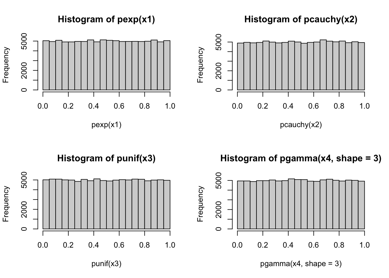 ## [1] 0.05 0.10 0.40 0.60 0.95As expected, we got the original values back - the normal quantile function and its cdf are inverses of each other.