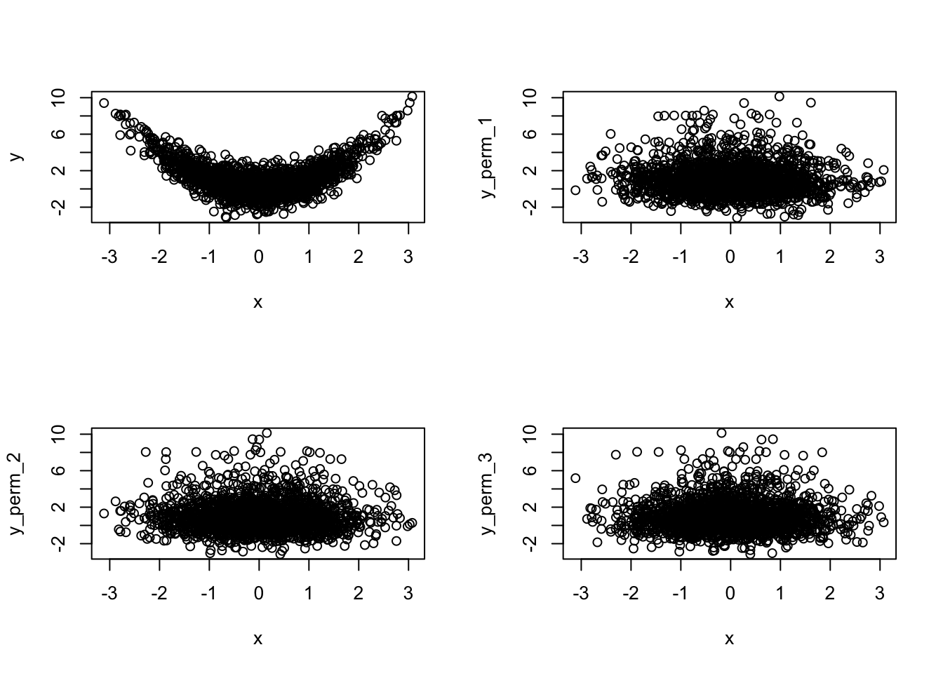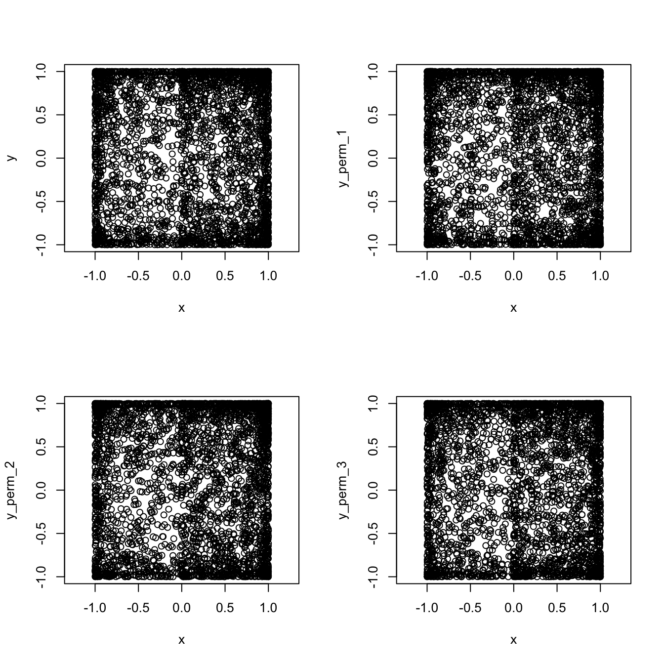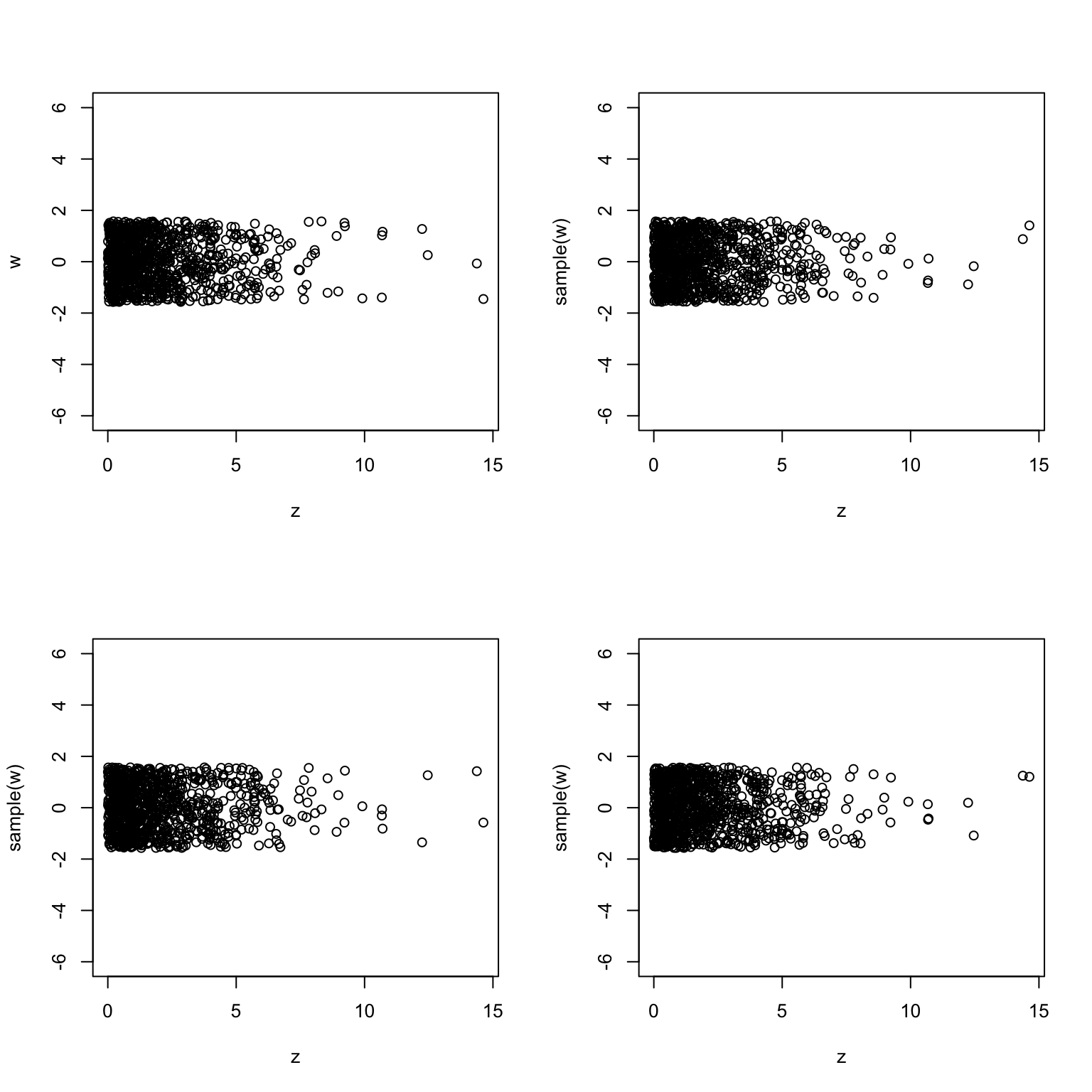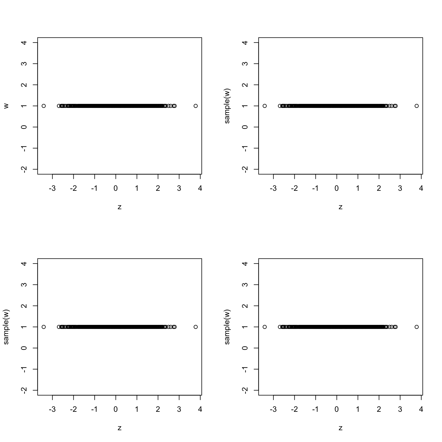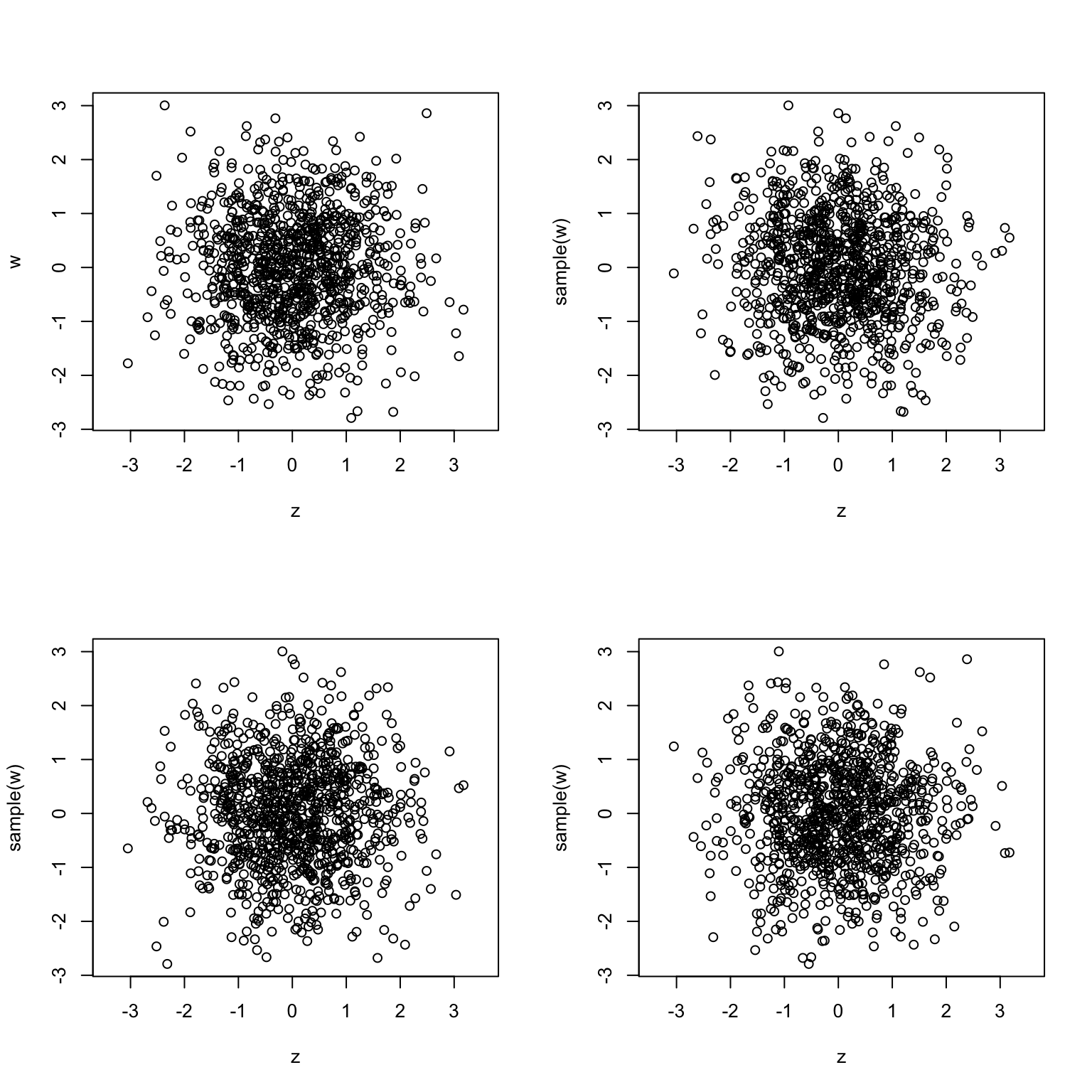 nsim = 10000 sims = data.frame(t(replicate(nsim, sample(c(1, 2, 3, 4, 5, 6), size = 3, replace = FALSE)))) colnames(sims) = c("x", "y", "z")The rejection method:
