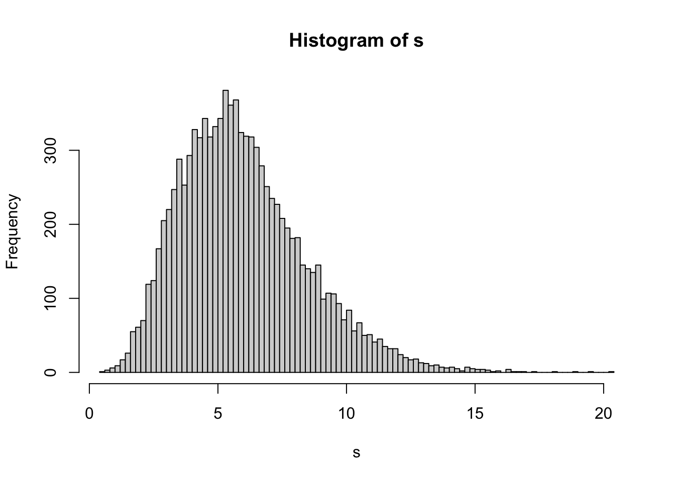 Still no luck, but we do observe values above 5 more often. By trial and error, we arrive at about \(1,000,000\) as the required number of simulations: