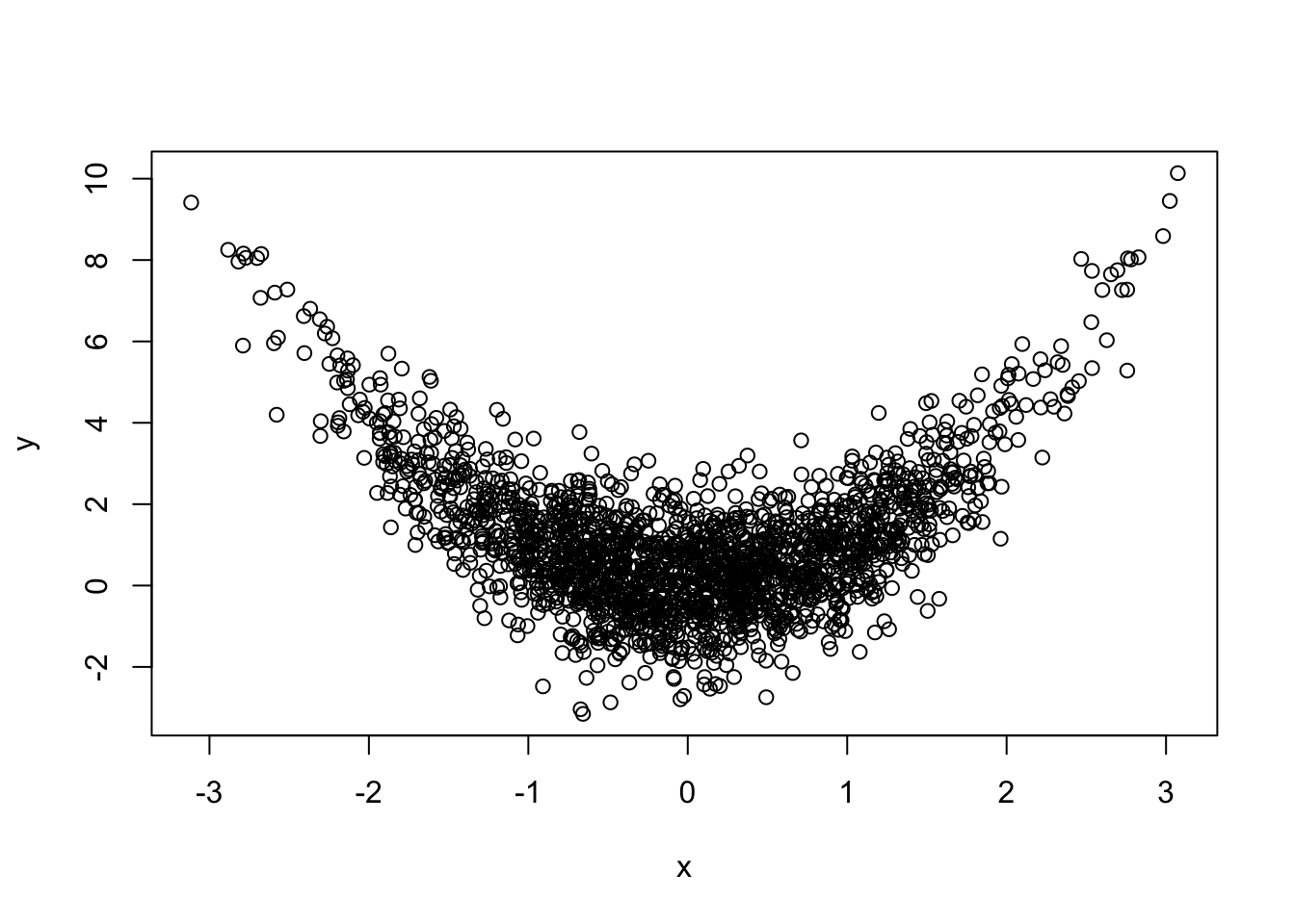 joint_distribution_long = data.frame( z = c(-1,-1,-1, 0,0,0, 1,1,1), w = c(-1,0,1, -1,0,1, -1,0,1) ) probabilities_long = c(0.2,0.1,0.0,0.1,0.2,0.1,0.0,0.1,0.2); sampled_rows = sample( x = 1:nrow(joint_distribution_long), size = 10000, replace = TRUE, prob = probabilities_long ) d_zw = joint_distribution_long[sampled_rows, ]Then we transform the results into \((X,Y)\) and output the table of relative frequencies: