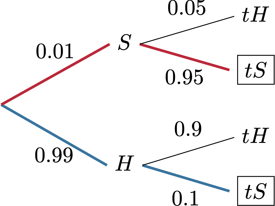The person can test positive (denoted by \(tS\) in the plot) in two ways. By actually being sick (\(S\)) and then testing positive, or by being healthy and then testing positive. Bayes formula (or simply a look at the picture above) gives us \[ {\mathbb{P}}[ S | tS ] = \frac{ 0.01 \times 0.95}{ 0.01\times 0.95 + 0.1\times 0.99 } \approx 0.088.\] Thus, even when the test is quite accurate, the probability of getting a false positive is very high.